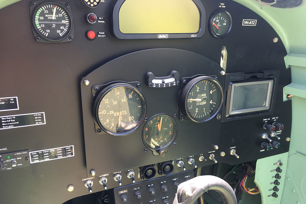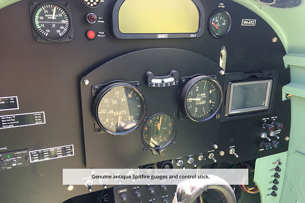 Even the interior of this aircraft is amazing. Garmin VHF and transponder and an Aera GPS blend with genuine Spitfire altimeter, VSI and control stick.